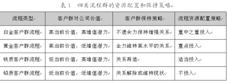 流程由活動、活動的邏輯順序、活動的實(shí)現(xiàn)方式、活動的承擔(dān)者四個基本要素組成。通過活動的整合來產(chǎn)生“流程多面手”或活動講廢除來減少成本,利用信息技術(shù)將“串聯(lián)”活動變成“并聯(lián)”活動來改變活動斬邏輯順序以提高流程效率,或者改變活動承擔(dān)者的數(shù)量或素質(zhì),這些都將導(dǎo)致流程群資源分配的變動。例如,銀行的業(yè)務(wù)流程設(shè)置:低價值客戶以電子設(shè)備的自助服務(wù)為主;中價值客戶以柜面服務(wù)為主;高價值客戶以大戶室一對一服務(wù)為主;設(shè)置專業(yè)化的理財中心,由客戶經(jīng)理全程代為辦理各項(xiàng)業(yè)務(wù),同時由高素質(zhì)的理財專家根據(jù)客戶的風(fēng)險收益偏好提供高質(zhì)量的理財產(chǎn)品等。可見,不同客戶其流程的資源配置差異較大。依據(jù)客戶群——流程矩陣,下表描述了四類流程群所對應(yīng)的四類客戶群的四種資源配置方式。