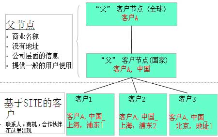 這樣對客戶的管理,尤其是對企業(yè)級(jí)客戶管理,造成了諸多不便,因?yàn)樵谂c客戶的商業(yè)行為,絕大多數(shù)時(shí)發(fā)生在SITE級(jí)別,就是與一個(gè)總公司的不同分公司的發(fā)生的交易行為。例如: