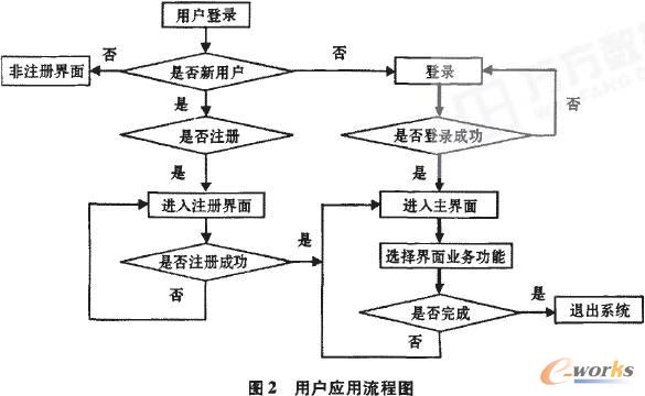 當(dāng)用戶與系統(tǒng)聯(lián)系時(shí),首先確定是否為注冊(cè)用戶,如果是注冊(cè)用戶,就可以通過客戶編碼和密碼登錄系統(tǒng),進(jìn)行業(yè)務(wù)的操作。否則,尋問用戶是否需要注冊(cè),如果客戶拒絕注冊(cè),則可以進(jìn)入一般功能界面,如公司新聞、各項(xiàng)政策等。如果客戶同意注冊(cè)并且注冊(cè)成功,那么就可以進(jìn)入系統(tǒng)業(yè)務(wù)操作流程。然后用戶搬據(jù)自身的需求,對(duì)系統(tǒng)的具體功能模塊進(jìn)行操作,以達(dá)到與企業(yè)數(shù)據(jù)庫交互目的,從而實(shí)現(xiàn)業(yè)務(wù)操作的及時(shí)性和移動(dòng)性。具體如圖2所示。
