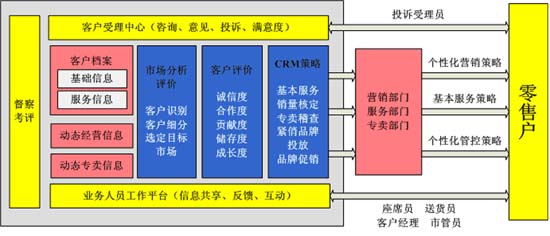 客戶管理:建立客戶全面檔案信息,提供客戶觀察器,對(duì)零售客戶的基本信息、網(wǎng)建信息、銷(xiāo)售信息、專(zhuān)賣(mài)信息等進(jìn)行360度分析查詢;對(duì)零售客戶進(jìn)行評(píng)價(jià)與分類(lèi),為差異化服務(wù)和“一對(duì)一營(yíng)銷(xiāo)”提供依據(jù)。