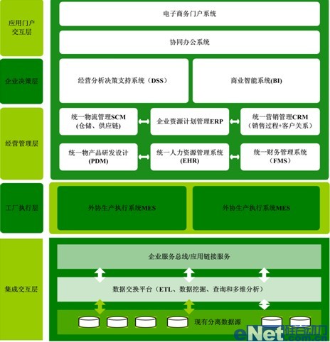 根據(jù)企業(yè)管理發(fā)展戰(zhàn)略及目標,需要考慮建設“集成化數(shù)字管控制造系統(tǒng)”,涵蓋企業(yè)決策層、企業(yè)經(jīng)營管理層。根據(jù)整體業(yè)務模式,企業(yè)經(jīng)營管理層又可以進一步分解為公司管理層和工廠執(zhí)行層;從信息化戰(zhàn)略支撐角度可以分解為企業(yè)門戶交互層、應用系統(tǒng)層、應用集成層和網(wǎng)絡支撐層。實現(xiàn)企業(yè)信息流、資金流、物流、商物流的高度集成、統(tǒng)一,為企業(yè)生產(chǎn)、經(jīng)營提供強有力的信息化支撐。
