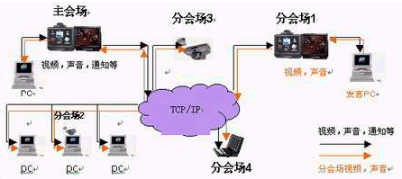 會議的組織,召開,管理由主會場來完成。因此,主會場的視頻,聲音,通知,指示,下達的文件資料各分會場都應(yīng)該收到。當(dāng)某分會場發(fā)言時,其視頻,聲音同樣要傳送給其他會場。(如下圖所示)上述所有動作的完成依賴組播技術(shù)。通過組播技術(shù)把主會場的各種數(shù)據(jù)發(fā)送到參加會議的分會場中,而且把發(fā)言分會場的視音頻數(shù)據(jù)發(fā)送給其他會場:即主會場和發(fā)言分會場的各種數(shù)據(jù)只要在網(wǎng)上發(fā)送一次,其他會場都將收到此數(shù)據(jù),(這就是有別于點對點通信方式的地方)而與這兩個會場在同一網(wǎng)段卻不參加會議的非成員不會收到數(shù)據(jù)(只要設(shè)備支持,這也是有別于廣播的地方)。因此,當(dāng)會議成員增加時,不會產(chǎn)生信息傳輸量劇增,帶來無法忍受的網(wǎng)絡(luò)延時和抖動。