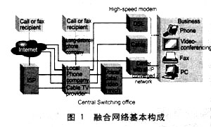 。。在網(wǎng)絡(luò)的不同層次,融合目標(biāo)可以歸納為:傳輸技術(shù)趨向一致,網(wǎng)絡(luò)層面實現(xiàn)互連互通,業(yè)務(wù)層上互相交叉,應(yīng)用層上趨向使用統(tǒng)一的協(xié)議與應(yīng)用軟件。傳輸通信層和中間網(wǎng)絡(luò)層是融合主要進行的層次。圖1為融合網(wǎng)絡(luò)的基本構(gòu)成。