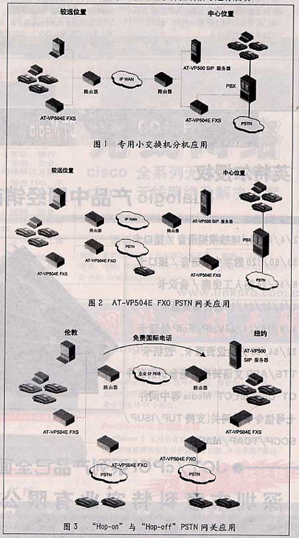 在圖2所示的應(yīng)用中,遠(yuǎn)程局位置直接附加了一個(gè)AT-VP504E FXO裝置,為PSTN提供IP電話網(wǎng)關(guān)服務(wù),IP語(yǔ)音呼叫被轉(zhuǎn)化為模擬格式通過標(biāo)準(zhǔn)電話線路進(jìn)行傳輸。同樣,來自普通電話網(wǎng)絡(luò)的呼入呼叫,也被轉(zhuǎn)化為IP呼叫通過企業(yè)IP網(wǎng)絡(luò)轉(zhuǎn)接。這就使本地PSTN呼叫者,可向企業(yè)或其他目的地打免費(fèi)長(zhǎng)途電話。