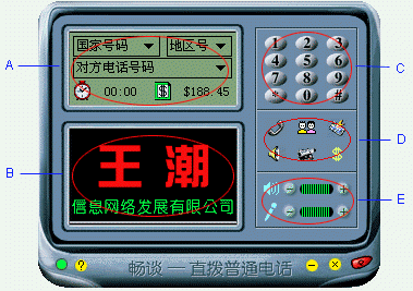 (如圖1)“王潮暢談語音全球通”的主界面。A部分是虛擬液晶顯示屏,這里顯示的內容與 D(功能鍵區(qū))相對應,B是廣告位,如果有興趣可以與王潮公司聯(lián)系作廣告(^_^),C是撥號區(qū),D是功能按鈕區(qū),集中了這個軟件的主要功能,E是音量調節(jié)區(qū)。整個界面簡潔合理。