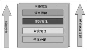 如圖所示,網(wǎng)絡管理貫穿于四個模塊建立過程中。特定的組件應針對網(wǎng)絡基礎(chǔ)設(shè)施的特定部分而實施。具體實施時,應首先從帶寬分配模塊開始,然后逐個上移。實施的模塊越多,保證的品質(zhì)會越高,但同時也增加了管理的復雜性,加大了維護成本。