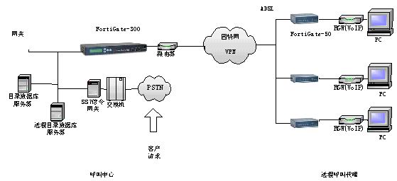 -300在總部,F(xiàn)ortiGate-50在遠(yuǎn)程代理,為呼叫中心總部和遠(yuǎn)程通信辦公室提供了可升級(jí)的解決方案,保證了良好的網(wǎng)絡(luò)傳輸性能,具有良好的擴(kuò)展能力,