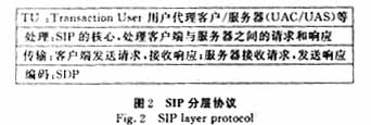 SIP本身是一種分層協(xié)議,如圖2所示。由此可見,SIP采用C/S結(jié)構(gòu),通過MESSAGE機(jī)制來建立會(huì)話。因?yàn)镾IP處理的是客戶端與服務(wù)器之間的請(qǐng)求和響應(yīng),所以SIP消息包括了請(qǐng)求消息和響應(yīng)消息。二者都具有相同的消息格式: