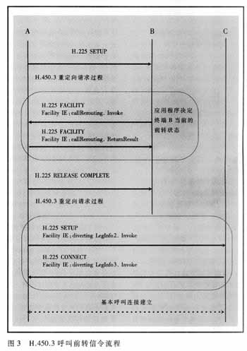 圖3顯示了可編程呼叫前轉(zhuǎn)的信令流程,在終端B的控制下通過把呼叫重新定向到一個新的目的地址而實現(xiàn)呼叫前轉(zhuǎn)。終端B在接收到SETUP消息后,發(fā)送一個包含前轉(zhuǎn)目的終端C地址的信令消息到呼叫發(fā)起終端A。然后終端A直接建立到終端C的連接,同時向終端C指明該業(yè)務的性質(zhì)和相應信息。