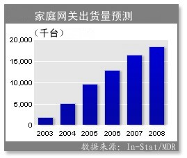 In-Stat/MDR分析師Mike Wolf說,未來5年家庭網關市場將推動寬帶CPE市場增長。市場將從2004年出貨低于500萬臺增長到2008年超過1800萬臺,年增長率30%。