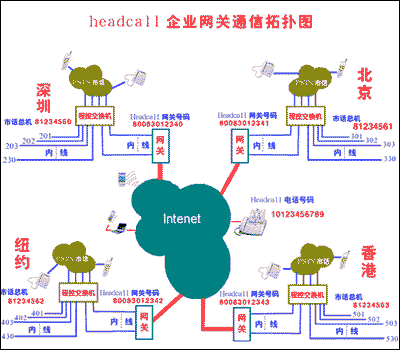 5,傳統(tǒng)的固話或手機(jī)也可通過當(dāng)?shù)氐腍eadcall的語音網(wǎng)關(guān)撥打全球的headcall電話及另一國(guó)家或地區(qū)的企業(yè)(有Headcall語音網(wǎng)關(guān))的總機(jī),這部分的費(fèi)用除了你要向當(dāng)?shù)仉娦沤患{市話費(fèi)外,其余都為零。(PSTN――Headcall)