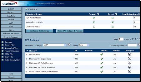 SonicWALL入侵檢測服務(wù)(IPS)能夠?yàn)閂oIP協(xié)議應(yīng)用層提供全面保護(hù)。IPS集成了一個可配置的超高性能掃描引擎,配合動態(tài)更新和擁有1900多攻擊和漏洞簽名的數(shù)據(jù)庫,可以保護(hù)網(wǎng)絡(luò)免受最復(fù)雜的木馬和變形威脅的影響。SonicWALL已經(jīng)利用一系列VoIP相關(guān)的簽名來擴(kuò)展其IPS簽名數(shù)據(jù)包,可以防止惡意業(yè)務(wù)流到達(dá)受保護(hù)的VoIP電話和服務(wù)器。