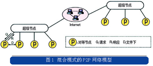 Skype是P2P技術演進到混合模式后的典型應用,它結合了集中式和分布式的特點,在網(wǎng)絡的邊緣節(jié)點采用集中式的網(wǎng)絡結構,而在超級節(jié)點之間采用分布式的網(wǎng)絡結構,混合模式的P2P網(wǎng)絡模型如圖1所示。