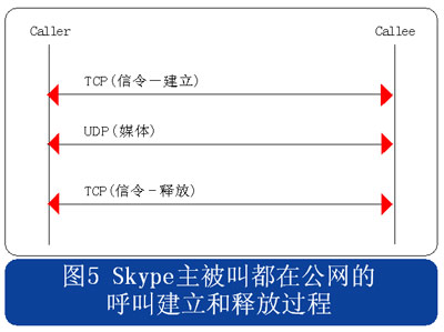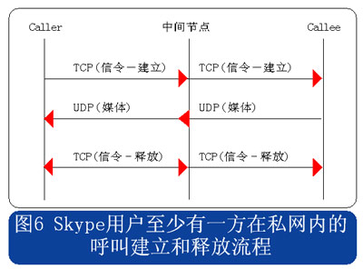 從上述流程圖可見,Skype的呼叫信令都采用TCP封裝,而媒體流則使用UDP封裝,當有任何一方用戶位于限制UDP包的防火墻內時,媒體流就會采用TCP封裝。另外當Skype用戶至少有一方位于私網(wǎng)內時,所有的信令和媒體消息都經(jīng)過一個或多個中間節(jié)點轉發(fā)。此時無需擔心用戶通話的媒體流因為經(jīng)過中間節(jié)點轉發(fā)而被竊聽,因為Skype采用了對消息進行端到端加密的機制。