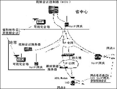 通過(guò)在全省部署VoIP系統(tǒng),網(wǎng)點(diǎn)VoIP網(wǎng)關(guān)可以通過(guò)H.245協(xié)議與視頻會(huì)議MCU(多點(diǎn)控制器)進(jìn)行通信能力的動(dòng)態(tài)協(xié)商,在國(guó)家、省和地市召開(kāi)視頻會(huì)議時(shí),網(wǎng)點(diǎn)可以通過(guò)普通電話(或者電話會(huì)議終端)參與會(huì)議,實(shí)現(xiàn)“聽(tīng)聲參會(huì)”,低成本地實(shí)現(xiàn)了行業(yè)視頻會(huì)議系統(tǒng)的延伸。