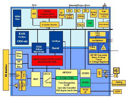 例如,SC14438是一個優(yōu)化了的CMOS芯片,能夠進行DECT(1.9GHz)內或2.4GHz ISM數字頻帶手機內需要的所有音頻、信號及數據處理。一個ADPCM代碼轉換器,一個低功耗的編解碼器(CODEC)及模擬前端被集成于該芯片中,提供麥克風與(動態(tài)的)揚聲器之間直接的連接。同時還整合了雙工免提操作。SC14438的設計適用于任一無線產品設計。一個專用的TDMA控制器能夠處理所有的物理層時隙和無線控制。美國國家半導體公司的標準小型RISC