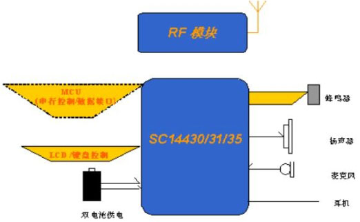 DECT的座機部分可以根據應用,選擇配置采用獨立模式或外接MCU的模式工作,方便用戶靈活擴展功能。外接MCU通過RS232口或SPI口與基帶處理器SC14438/37/35連接,實現控制/數據的交互。