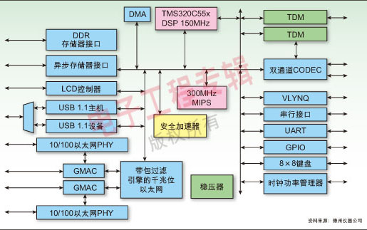 德州儀器(TI)公司最新的VoIP處理器設計用于確保在中小企業(yè)應用中提供無延遲的語音服務。這種名為TNETV1051的處理器集成了1個300MHz的MIPS處理器、1個150MHz的C55x數(shù)字信號處理器(DSP)、2個千兆位以太網(wǎng)(GbE)媒體訪問控制器(MAC),以及1個片內GbE交換器。