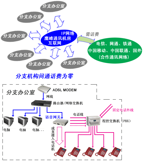 針對以上現(xiàn)狀,鷹峰NGN組網(wǎng)方案協(xié)助A公司在中國總部進(jìn)行了周密的分析與考察并就相關(guān)的產(chǎn)品技術(shù)進(jìn)行了深入的研究與探討,提供了以A公司在中國現(xiàn)有數(shù)據(jù)專網(wǎng)為基礎(chǔ)的,融合語音通信的解決方案,這是一套充分利用A公司現(xiàn)有數(shù)據(jù)網(wǎng)絡(luò)資源優(yōu)勢,可行、先進(jìn)、完整的企業(yè)VoIP通信解決方案。將最終以A公司目前在中國所有機構(gòu)為結(jié)點,組成在中國的VoIP網(wǎng)絡(luò)。方案匯集了鷹峰通訊所有最新PBX/語音網(wǎng)關(guān)及網(wǎng)絡(luò)通訊技術(shù)及設(shè)備,保護(hù)了原有的交換機資源,不改變撥號習(xí)慣,體現(xiàn)了非?捎^的經(jīng)濟效益,并且實現(xiàn)了快速實施,將投入的時間,資金縮到了最小。