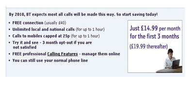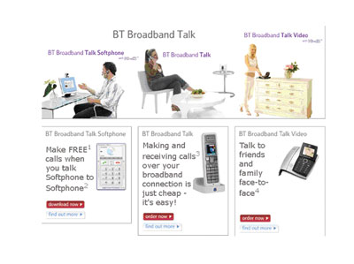 BTBroadbandTalk產(chǎn)品在其套餐使用費中包括了一定時段的免費國內(nèi)時長,國際長途按照通話量另外收取。VoIP通話所需要的寬帶電話設(shè)備由BT免費提供給客戶。