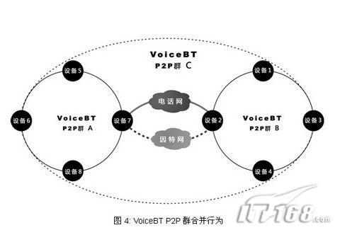 純P2P是采用分布式信息共享技術(shù)實(shí)現(xiàn)的無服務(wù)器網(wǎng)絡(luò)體系結(jié)構(gòu),VoiceBT P2P群是一個(gè)采用純P2P技術(shù)并由所有callfreee設(shè)備自發(fā)組成的智能P2P網(wǎng)絡(luò),電話線交互IP定位信息技術(shù)不但可以使網(wǎng)絡(luò)不需要服務(wù)器而且能夠極大的加快網(wǎng)絡(luò)收斂速度和增強(qiáng)網(wǎng)絡(luò)穩(wěn)定性。VoiceBT P2P群基本行為分為合并和查詢兩種。本文用圖例的方式簡(jiǎn)要的介紹一下這兩種行為。