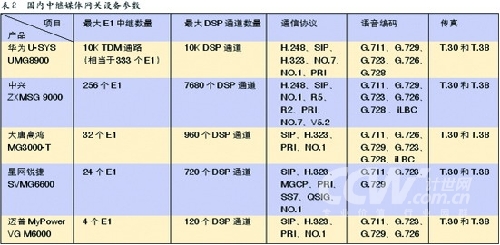 結(jié)合表2中的數(shù)據(jù),可以看出國內(nèi)中繼媒體網(wǎng)關(guān)設(shè)備制造商的定位非常類似于軟交換設(shè)備的市場定位,從設(shè)備支持的最大E1數(shù)和最大DSP通道數(shù)來看,華為和中興的中繼媒體網(wǎng)關(guān)主要是面向運(yùn)營商客戶,不難發(fā)現(xiàn)網(wǎng)關(guān)支持的協(xié)議也最為豐富,能夠滿足和運(yùn)營商不同協(xié)議體系網(wǎng)絡(luò)互通的需要。而大唐高鴻、星網(wǎng)銳捷和邁普的中繼媒體網(wǎng)關(guān)主要定位在企業(yè)行業(yè)客戶。