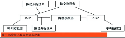 我國通信行業(yè)國家標(biāo)準(zhǔn)《基于軟交換的綜合接入設(shè)備測試方法》中明確了IAD設(shè)備九個大項(xiàng)的測試,分別是基本功能測試、協(xié)議測試、接口測試、話音業(yè)務(wù)測試、數(shù)據(jù)業(yè)務(wù)測試、性能測試、OAM測試、硬件項(xiàng)目測試和環(huán)境測試。按照圖4所示的測試拓?fù)鋱D進(jìn)行連接,就可以按照測試方法中的測項(xiàng)要求,逐一得出測試結(jié)果。