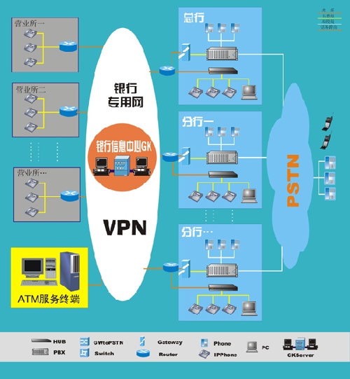 3、如上圖所示,已加裝了PBX的總行或分行,在以前的PBX上加裝GW,使得PBX通過GW進(jìn)入銀行的數(shù)據(jù)專網(wǎng)并注冊(cè)到GK,GK給其分配內(nèi)網(wǎng)的號(hào)碼,這樣在不淘汰原有設(shè)備的情況下,有PBX的依然可以與網(wǎng)內(nèi)的其他終端進(jìn)行零話費(fèi)通話。