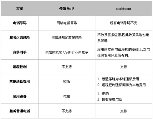 可以看到,callfreee方案主要在服務(wù)的成本與穩(wěn)定性、保留原來(lái)電話(huà)號(hào)碼以及多種設(shè)備的應(yīng)用等方面有了改變,并且?guī)缀醵际轻槍?duì)傳統(tǒng)VoIP的不足來(lái)進(jìn)行的完善。對(duì)于這些不同,我們不妨以表格的形式來(lái)表現(xiàn),這樣更加一目了然。