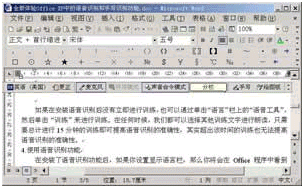 在安裝了語音識別功能后,如果你設(shè)置顯示語言欄,那么你將會在Office程序中看到如圖14所示的麥克風(fēng)圖標(biāo)(如果未看到,請從"工具"菜單中選中"語音"項(xiàng)),工作時(shí)將在"聽寫"和"聲音命令"模式之間進(jìn)行切換。
