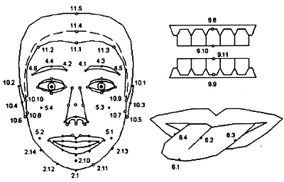 現(xiàn)在運(yùn)行的系統(tǒng)中多為參數(shù)控制系統(tǒng),其中控制參數(shù)也多采用MPEG-4所定義的人臉動畫參數(shù)(facial animation parameter,FAP)。MPEG-4制定了一整套人臉模型化描述方法,包括用于定義人臉模型的面部定義參數(shù)(facial define parameters,FDP)和一組用于定義人臉面部動作的人臉動畫參數(shù)FAP。其中FDP通過對人臉上84個特征點(diǎn)的位置信息來定義人臉模型,這些點(diǎn)不僅包括外表看得見的人臉特征點(diǎn),還包括了舌頭、牙齒等口腔內(nèi)器官的特征點(diǎn),如圖1所示。