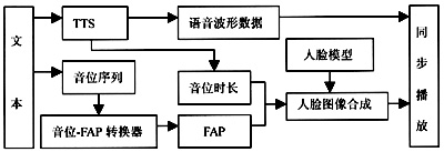 FAP一共有68個參數(shù),包括兩個高級參數(shù)和66個低級參數(shù)。高級參數(shù)是視位(viseme)和表情(expression),視位分為15個,分別表示人們發(fā)某一音位時的面部動作;表情分為高興、悲傷、憤怒、害怕、厭惡、驚奇六種。66個低級參數(shù)用來控制部分FDP特征點(diǎn)的運(yùn)動,進(jìn)而形成各種復(fù)雜的人臉動作。這些標(biāo)準(zhǔn)的制定極大地推動了參數(shù)控制合成方法的發(fā)展,使這種方法在人機(jī)交互、計(jì)算機(jī)網(wǎng)絡(luò)交談、游戲動畫等方面得到更為廣泛的應(yīng)用,圖2 是參數(shù)控制的TTVS系統(tǒng)的基本框架。