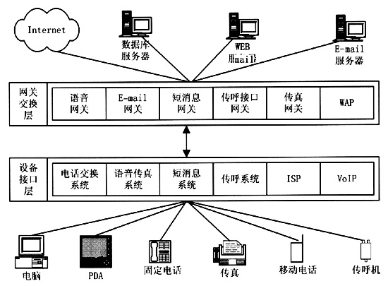 統(tǒng)一消息平臺集成了固定電話網(wǎng)、移動電話網(wǎng)和Internet網(wǎng)絡。目前,電話網(wǎng)和Internet網(wǎng)各自擁有獨立的網(wǎng)絡資源和信息服務領域,而這兩大網(wǎng)絡的用戶群存在著很大的交叉。電話的使用在中國已經(jīng)占有很高的普及率,傳統(tǒng)的160/168聲訊服務已經(jīng)成為中國百姓所熟悉的最具代表性的電話信息服務,而Internet作為在中國剛剛興起的信息媒體,尚需要普通百姓逐漸認識它、使用它。統(tǒng)一消息平臺將電話網(wǎng)和Internet網(wǎng)結(jié)合在一起,極大地擴大了兩大網(wǎng)絡各自的用戶群,電話用戶可以用電話或者傳真獲取Internet上的信息,電子郵件服務也可以不局限于Internet,而能對廣大的電話用戶開放。統(tǒng)一消息平臺為用戶帶來的是信息的方便、及時,使人們在任何時間、任何地點都能夠獲取需要的信息。