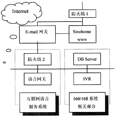 160/168聲訊平臺通過炎黃新星的網(wǎng)關產(chǎn)品與Internet相聯(lián),為了保證原有聲訊系統(tǒng)的安全性,在炎黃新星多終端信息訪問平臺的網(wǎng)絡結(jié)構(gòu)中增加了防火墻設置,原有的160/168聲訊平臺置于防火墻的后端,只與炎黃新星的語音合成網(wǎng)關存在通信聯(lián)系。