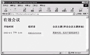 如果在前面已設置了提醒功能,那么在臨近會議前屏幕上將出現(xiàn)提醒窗口。教師機和學生機有三種方法可以參加會議:點擊提醒窗口中[參加會議]按鈕;或者不等提醒,直接點擊會議邀請函中的鏈接打開會議網(wǎng)頁;最好的方式還是打開IE,輸入網(wǎng)址http://x/conferencing/list.asp進入會議(x為Exchange服務器的IP地址或計算機名),如圖3。