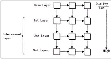 關(guān)于分層可擴展性編碼的研究可以追溯到10年前,目前它已經(jīng)被許多現(xiàn)行的國際壓縮標(biāo)準(zhǔn)接納,例如H.263+和MPEG-4。分層可擴展編碼主要有三種:時域可擴展性、空域可擴展性和質(zhì)量可擴展性。其中質(zhì)量可擴展性也稱為PSNR可擴展性,原因是視頻質(zhì)量通常用峰值信噪比(PSNR)來衡量。