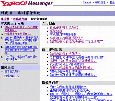 選擇工具->開啟我的攝像頭后,就會彈出“我的即時影像”窗口(圖4),如果你的攝像頭安裝連接正常,可以馬上從這個窗口中看到你的影像;如果你的攝像頭正常,但在窗口中卻沒有看到影像,你可以在聯(lián)網(wǎng)的情況下選擇當前窗口中的幫助->即時影像幫助進入相關(guān)網(wǎng)頁(圖5)對你的攝像頭進行雅虎通的兼容性測試,或者尋求更為詳細的幫助。
