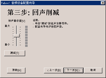 選擇幫助->音頻設(shè)備配置向?qū)?圖2),會彈出“音頻設(shè)備配置向?qū)А贝翱?圖3),這個向?qū)䦷椭銓P聲器、麥克風、回音、網(wǎng)絡(luò)連接等項目進行標準的測試和設(shè)置。