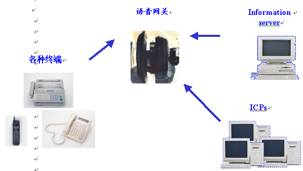在這樣的體系結構中,各種終端通過PSTN網絡聯接到語音網關,而通過語音網關來訪問后臺的數據服務、應用服務,或者通過互聯網絡訪問各個語音ICP。