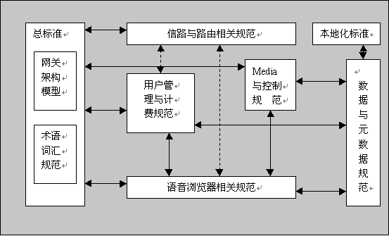通過分析國際上各種語音網關系統極其技術規(guī)范,特別是參照 W3C組織的"Voice Browser" Activity的框架,我們認為作為一個比較完整的語音網關標準體系,應該包含以下具體標準規(guī)范的制定,通常稱之為標準需求。下圖顯示所需的規(guī)范類型及其相互關聯。