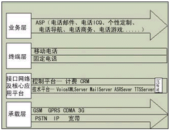 企業(yè)利用語(yǔ)音門戶,可以通過節(jié)省人工座席成本實(shí)現(xiàn)低成本地發(fā)布信息,提供客戶服務(wù),而且可以實(shí)現(xiàn)其它有價(jià)值的業(yè)務(wù),開創(chuàng)新的市場(chǎng)空間和利潤(rùn),其業(yè)務(wù)系統(tǒng)層次如圖2所示。