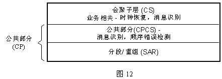 ATM適配層,是ATM核心(包括ATM層和物理層,與業(yè)務(wù)無(wú)關(guān))和高層間的接口(見(jiàn)圖5),它是為使ATM層能適應(yīng)不同業(yè)務(wù)類(lèi)型而設(shè)置的,故ATM對(duì)各種業(yè)務(wù)承載能力集中體現(xiàn)在ATM適配層。ATM適配層又細(xì)分為若干子層。具體如下圖12。