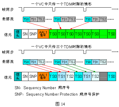 在同一個(gè)虛通道(VC)中,AAL1還支持一個(gè)或多個(gè)DS0(64Kbps)。當(dāng)虛通道中只有一個(gè)DS0話音時(shí),可以使用無(wú)結(jié)構(gòu)數(shù)據(jù)格式(UDF:Unstructured Data Format)傳送,這是一種面向比特的技術(shù);當(dāng)有多個(gè)DS0同時(shí)傳送時(shí),必須使用結(jié)構(gòu)化數(shù)據(jù)格式(SDF:Structured Data Format),此時(shí)各DS0數(shù)據(jù)流按字節(jié)依次傳送,即是面向字節(jié)的。這兩種格式的區(qū)別如下圖13所示。其中AAL1指針用于指示多DS0時(shí),第一個(gè)DS0字節(jié)位置,以便定時(shí)。利用AAL1可以實(shí)現(xiàn)ATM對(duì)STM(TDM)信號(hào)的傳送,見(jiàn)圖14。