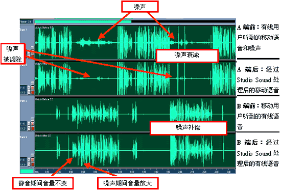 這里的結(jié)果顯示出,PSTN側(cè)收聽器接收到的噪音是如何被大大降低的,同時PSTN側(cè)說話的音量在無線側(cè)出現(xiàn)大聲的噪音期間被顯著地放大了。通過遍及全球的類似場合試驗,在應用Studio Sound之前和應用之后通話質(zhì)量的不同已經(jīng)深刻為許多業(yè)務提供商所了解。