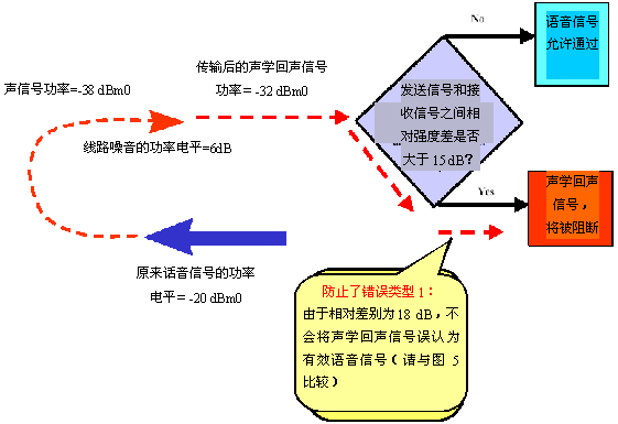 當(dāng)通信鏈路的的另一端被設(shè)計(jì)為傳輸可變強(qiáng)度的信號時(shí),"錯(cuò)誤類型1"的影響會(huì)急劇增大。在這種情況下,根據(jù)功率電平的絕對差異來決定阻斷/允許信號的聲學(xué)回聲控制器會(huì)增大"錯(cuò)誤類型1"出現(xiàn)的可能性。也就是說,使用絕對功率電平差異時(shí),將聲學(xué)回聲信號誤認(rèn)為有效語音信號的概率很大。