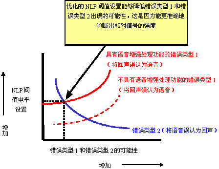 dB)能夠顯著降低將雙對話語音信號誤認(rèn)為聲學(xué)回聲信號的概率,從而防止了"錯(cuò)誤類型2"?傊"錯(cuò)誤類型1"(實(shí)線曲線,具有語音增強(qiáng)特性)和"錯(cuò)誤類型2"曲線的交叉點(diǎn)上,通過與之對應(yīng)的NLP設(shè)置,可以獲得最佳的性能(請參見圖10)。