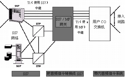 如圖14所示,SS7/MF網(wǎng)關(guān)可以實(shí)現(xiàn)SS7信令到MF(多頻)信令的轉(zhuǎn)換,使現(xiàn)有MF信令交換機(jī)無須升級(jí)就能擁有SS7信令能力。混合了SS7和基于音頻信令的呼叫建立環(huán)境能為各種運(yùn)營商經(jīng)濟(jì)實(shí)用的SS7網(wǎng)絡(luò)接入方案,采用這一方案的有蜂窩電話運(yùn)營商、本地電話運(yùn)營商、長途電話運(yùn)營商和其它一些仍使用舊式交換機(jī)的電話運(yùn)營商。