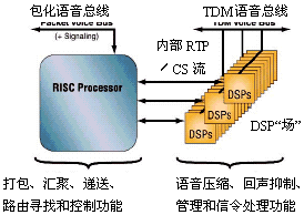 這種新型半導(dǎo)體元件被叫作語音處理器(VP),它不是技術(shù)創(chuàng)新成果,而只是傳統(tǒng)DSP核心和通用RISC處理器在一個或兩個硅片上的重新包裝和集成。DSP核心完成VoP的壓縮、回聲抑制和各種信號處理任務(wù),而RISC處理器完成VoP的匯聚和打包處理。