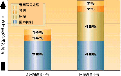 如圖4所示,是一個典型VoP系統大約的相對成本構成。第一根柱圖代表無壓縮語音業(yè)務,而第二根柱圖代表壓縮語音業(yè)務。這個柱形圖說明:回聲抑制和壓縮是實現這類網關的語音處理技術中成本最高的兩個功能。如果這兩種業(yè)務功能通過某一技術實現而能在密度和功耗方面得到一個數量級性質的改善,那麼人人都能從中受惠。
