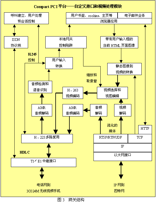 圖3所示為網(wǎng)關(guān)重要組成的分解圖。網(wǎng)關(guān)機箱很可能是一個Compact PCI機箱,機箱中包含了作為網(wǎng)絡(luò)中一個節(jié)點的所有組件;镜囊曨l呼叫和瀏覽器應(yīng)用可以運行在主處理器上,但T1或E1接口需要由附加模塊來支持。為了支持大量的端口,還需要附加的以太網(wǎng)接口和自定義的視頻處理模塊。T1/E1接口通過公共電話網(wǎng)接入無線交換中心,也可以直接接入到無線交換中心。以太網(wǎng)接口會通過標準IP路由器接入到因特網(wǎng)。